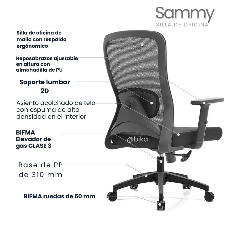 Su base de polipropileno de 310 mm y ruedas BIFMA de 50 mm aseguran estabilidad, resistencia y desplazamiento suave en distintos tipos de superficie. Todo esto convierte a la silla Sammy en una excelente opción para oficinas, escritorios en casa o espacios corporativos que valoran la ergonomía y el diseño funcional.