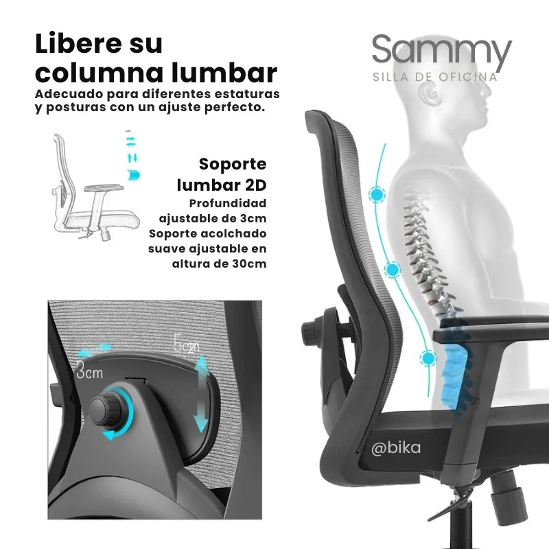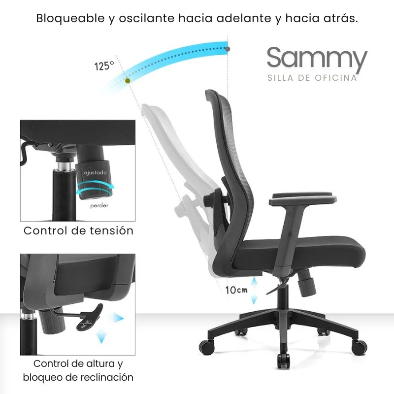 La Silla de Oficina Sammy está diseñada para ofrecer comodidad, soporte ergonómico y funcionalidad en entornos laborales modernos. Su respaldo alto en malla transpirable se adapta a la forma natural de la espalda, brindando ventilación constante y una postura saludable durante toda la jornada.