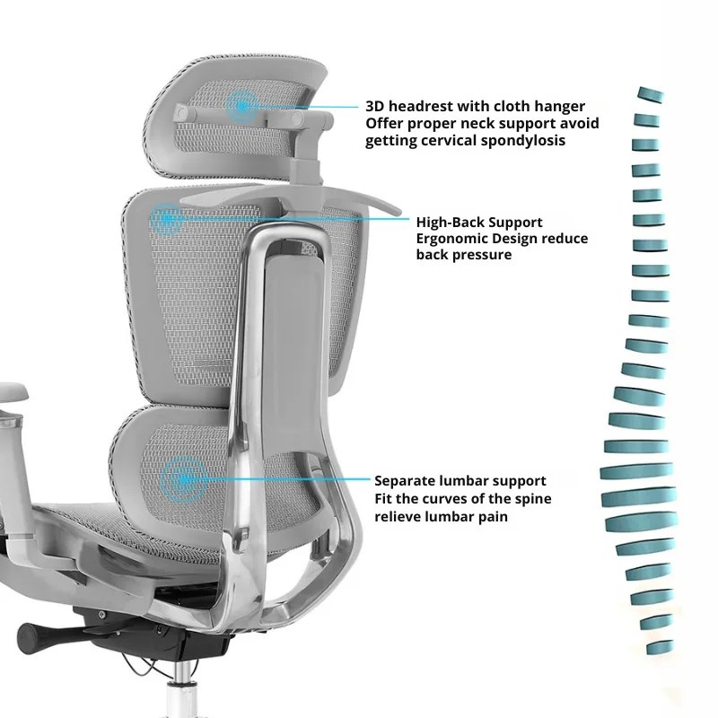 Su respaldo completo en malla transpirable es completamente regulable en altura, brindando una adecuada ventilación y adaptabilidad a la postura de cada usuario. Incorpora un soporte lumbar independiente, que protege la zona baja de la espalda y previene molestias comunes asociadas al trabajo de oficina.