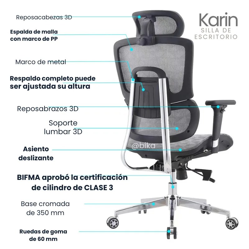 Cuenta con reposacabezas 3D, reposabrazos 3D y asiento deslizante para adaptarse a diferentes usuarios, reduciendo la fatiga y mejorando la productividad. Su mecanismo con elevador de gas clase 3 certificado BIFMA garantiza durabilidad, mientras que la base cromada de 350 mm y ruedas de nailon de 60 mm ofrecen estabilidad y movilidad suave.