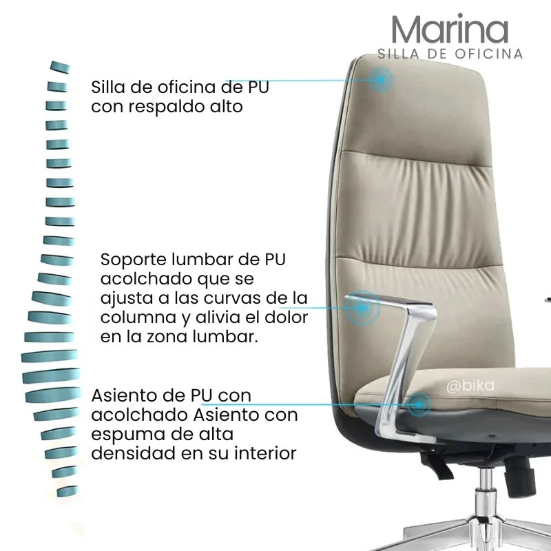 La Silla de Oficina Presidente Marina está diseñada para quienes buscan la combinación perfecta entre comodidad, estilo y durabilidad en su espacio de trabajo. Su diseño ergonómico de respaldo alto ofrece un soporte ideal para la espalda, ayudando a mantener una postura correcta durante largas jornadas frente al escritorio.